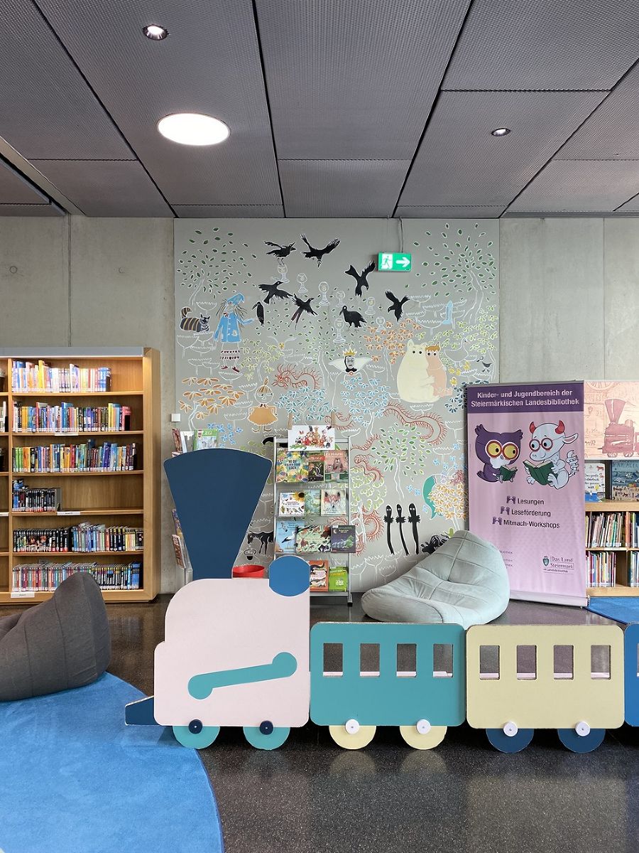 Bereits seit knapp fünf Jahren liegt der Kinder- und Jugendbereich im Herzen der Steiermärkischen Landesbibliothek. Er ist Teil des 30.000 Bände umfassenden Freihandbereichs der Bibliothek. Anlässlich dieses Jubiläums wurde der Kinder- und Jugendbereich neu „gebrandet": die Leseeule und der steirische Bücherpanther wachen nunmehr über deutsche und englische Bücher, e-Books, Zeitschriften, über 200 Tonies und Hör-CDs. Viele Leser*innen (nicht nur Kinder) nehmen in dem gemütlich gestalteten Bereich Platz, schmökern und borgen sich Medien aus. Bis zum 19. Geburtstag wird dafür gerne die kostenlose Kinder- und Jugendkarte genutzt.