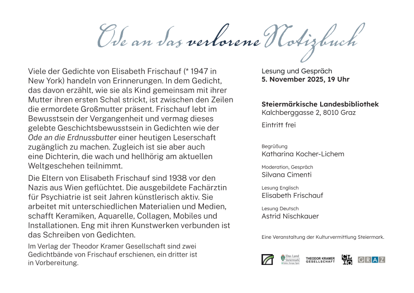 The Lost Notebook/ Das verlorene Notizbuch. Gedichte (E/D). Übersetzt von Astrid Nischkauer, Wien.