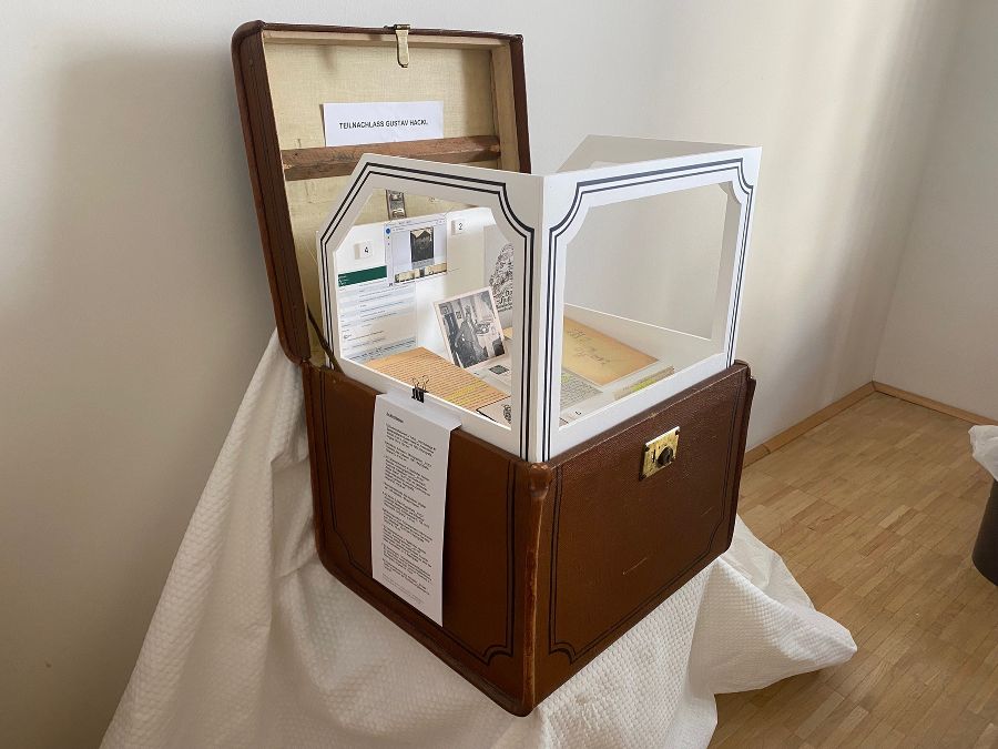 Im Projekt wurden die Schritte von der Erfassung bis zur digitalen Präsentation standardisiert. Die Ausstellung im Kofferformat ist eine Miniaturversion, die beim Öffnen durch ein Hebesystem aufpoppt. Sie bietet Einblicke in den Nachlass von Dr. Hackl sowie in die Projektarbeit selbst, insbesondere in die angewandte Systematik und Katalogisierung. Die Ausstellung ist somit eine außergewöhnliche und mobile Präsentationsform, die sowohl den Bestandsbildner als auch sein literarisches Werk beleuchtet.