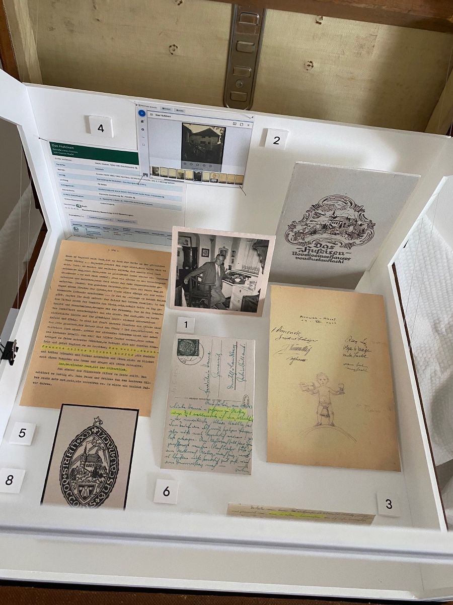 Für die analoge Präsentation beschritt das Projektteam in Zusammenarbeit mit der LB-Buchbinderei neue Wege und kuratierte die erste "Koffer-Popup-Miniatur-Ausstellung". Diese gibt zum einen den inhaltlichen Einblick in den Nachlass und zum anderen dokumentiert sie die Projektarbeit an sich (Systematisierung nach RNAB[1], Katalogisierung). Beim Öffnen des Koffers poppt die Ausstellung durch ein Hebesystem auf, die Objekte sind in Miniaturansicht dargestellt.